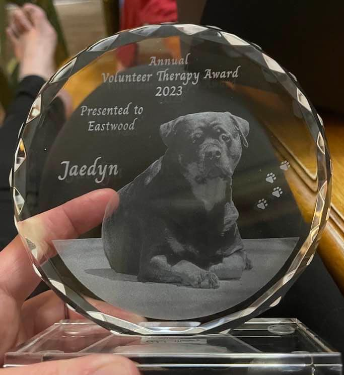 Jaedyn passed away in 2021 from osteosarcoma. This award honors her memory and all Rottweilers who change lives through love, dedication, and service to people in need.